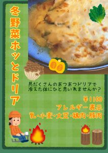 「冬野菜ホッとドリア」 1,100円は、鶏肉や冬野菜にたっぷりのチーズをオーブンで焼き上げた一品です。